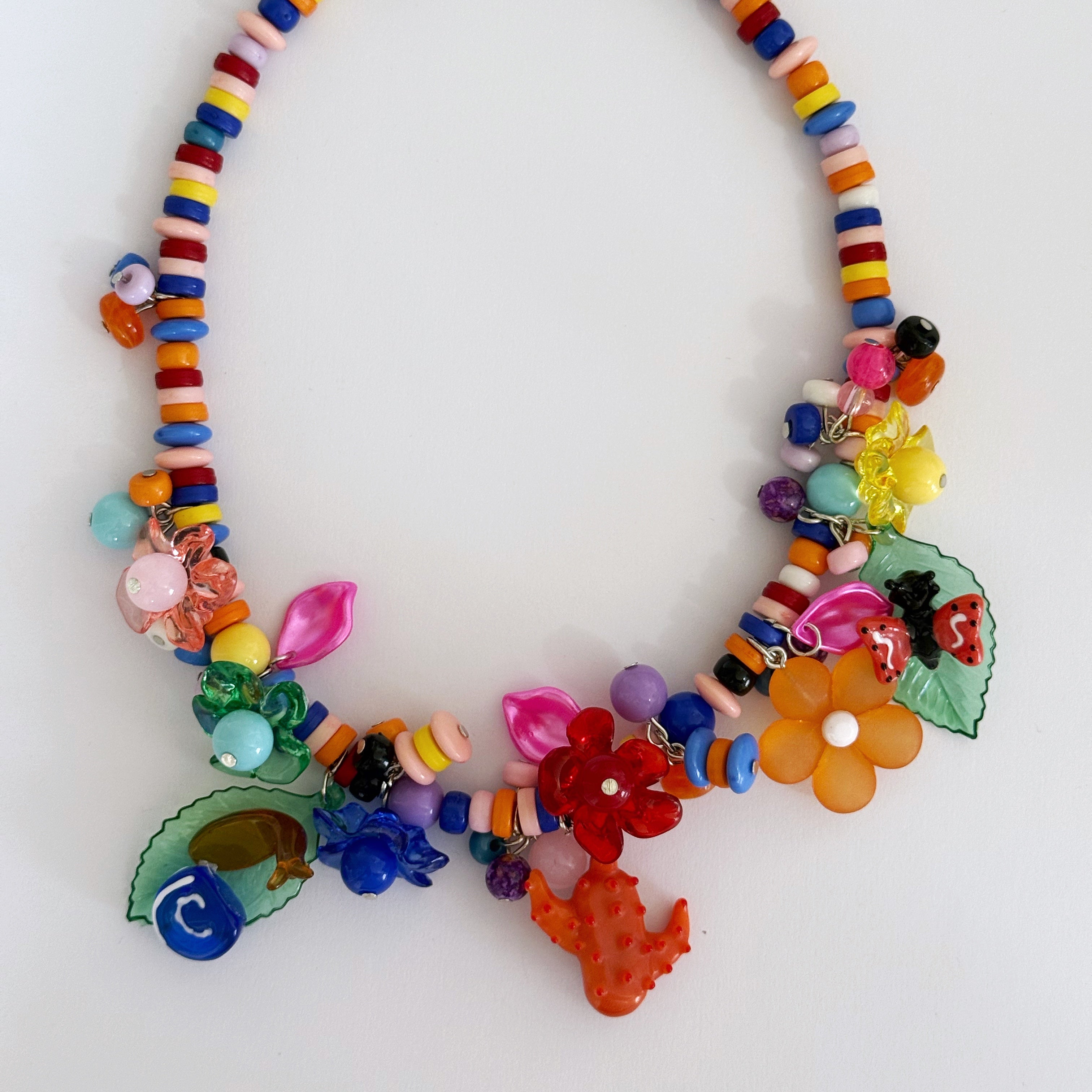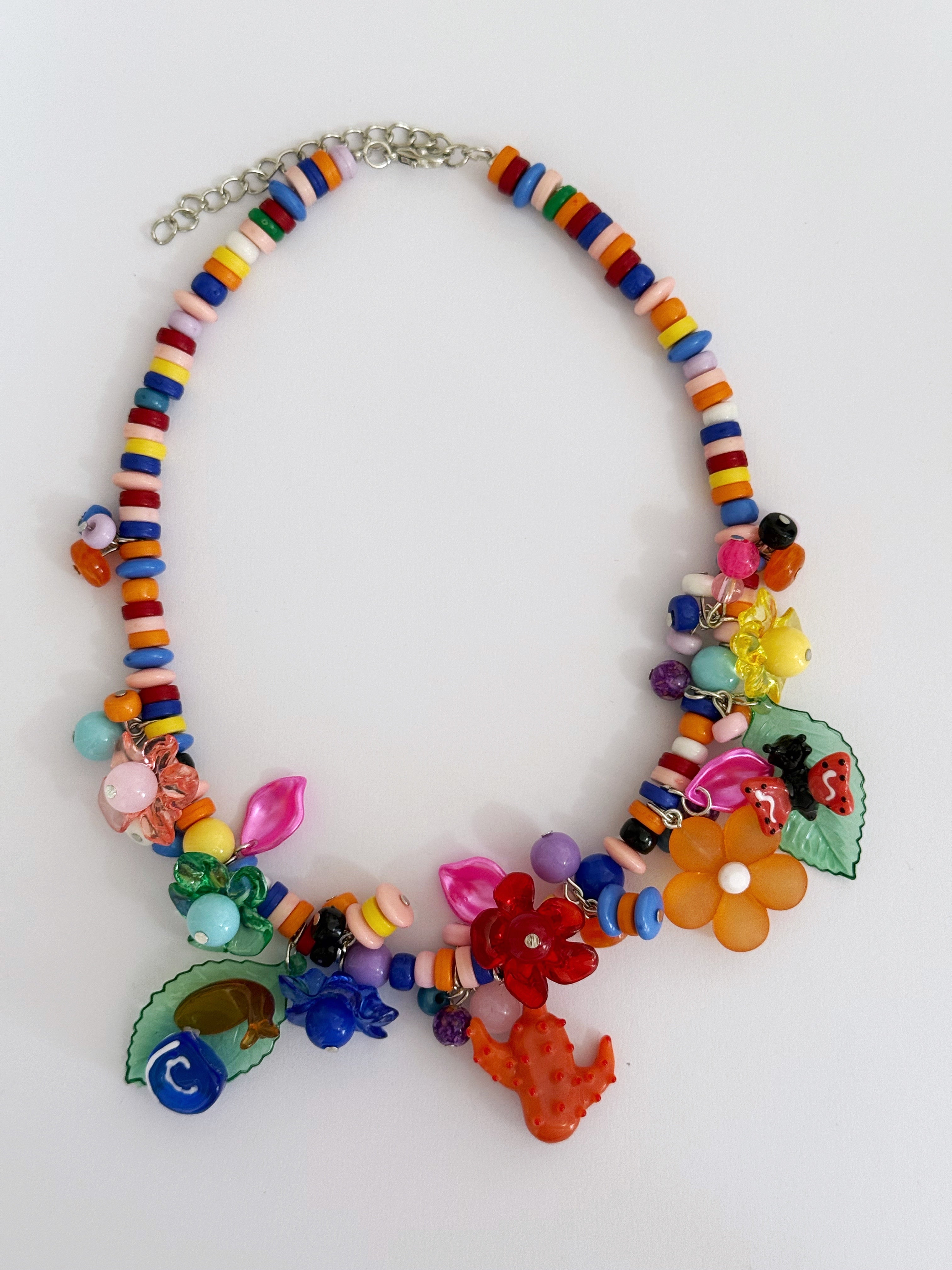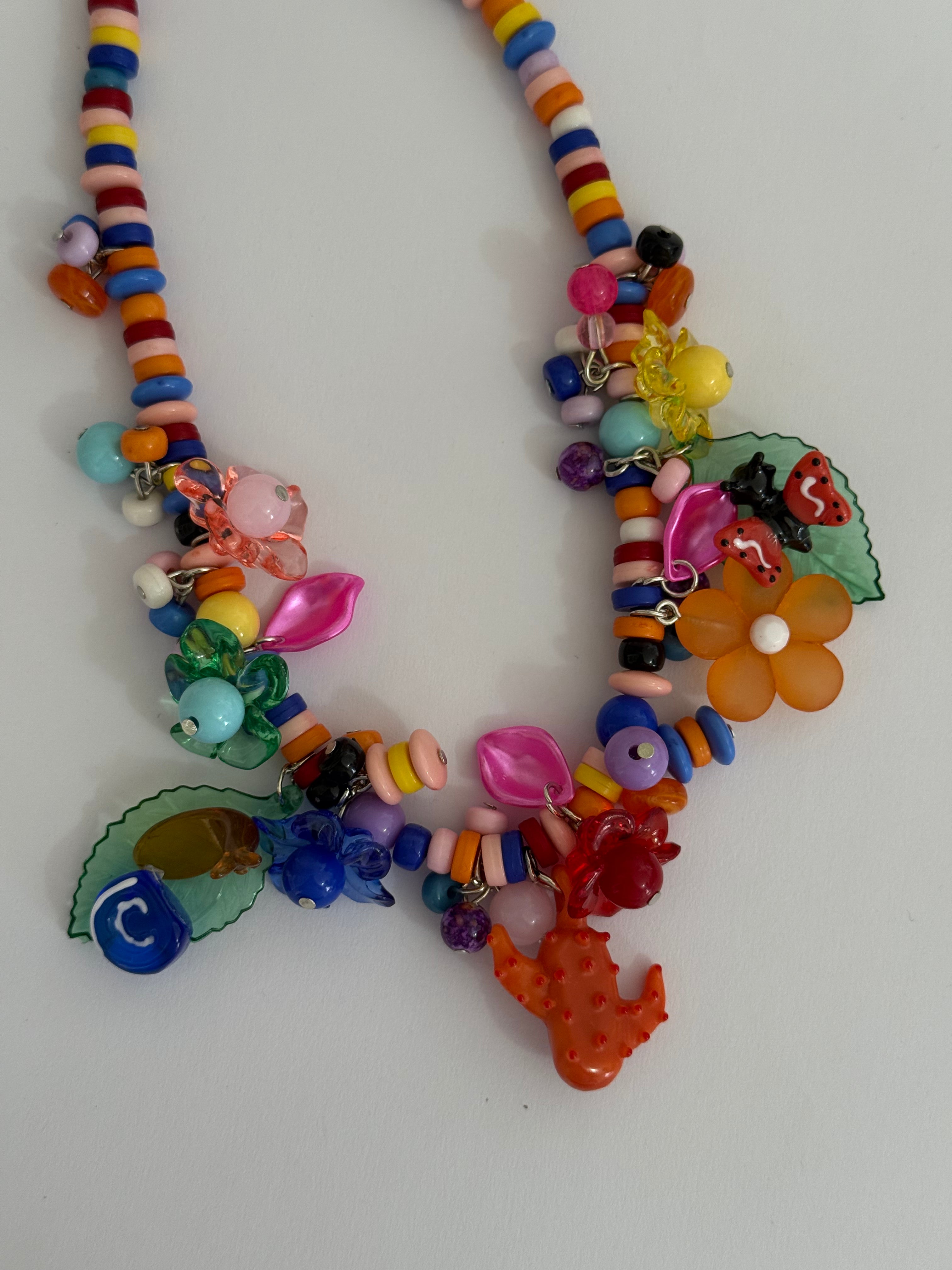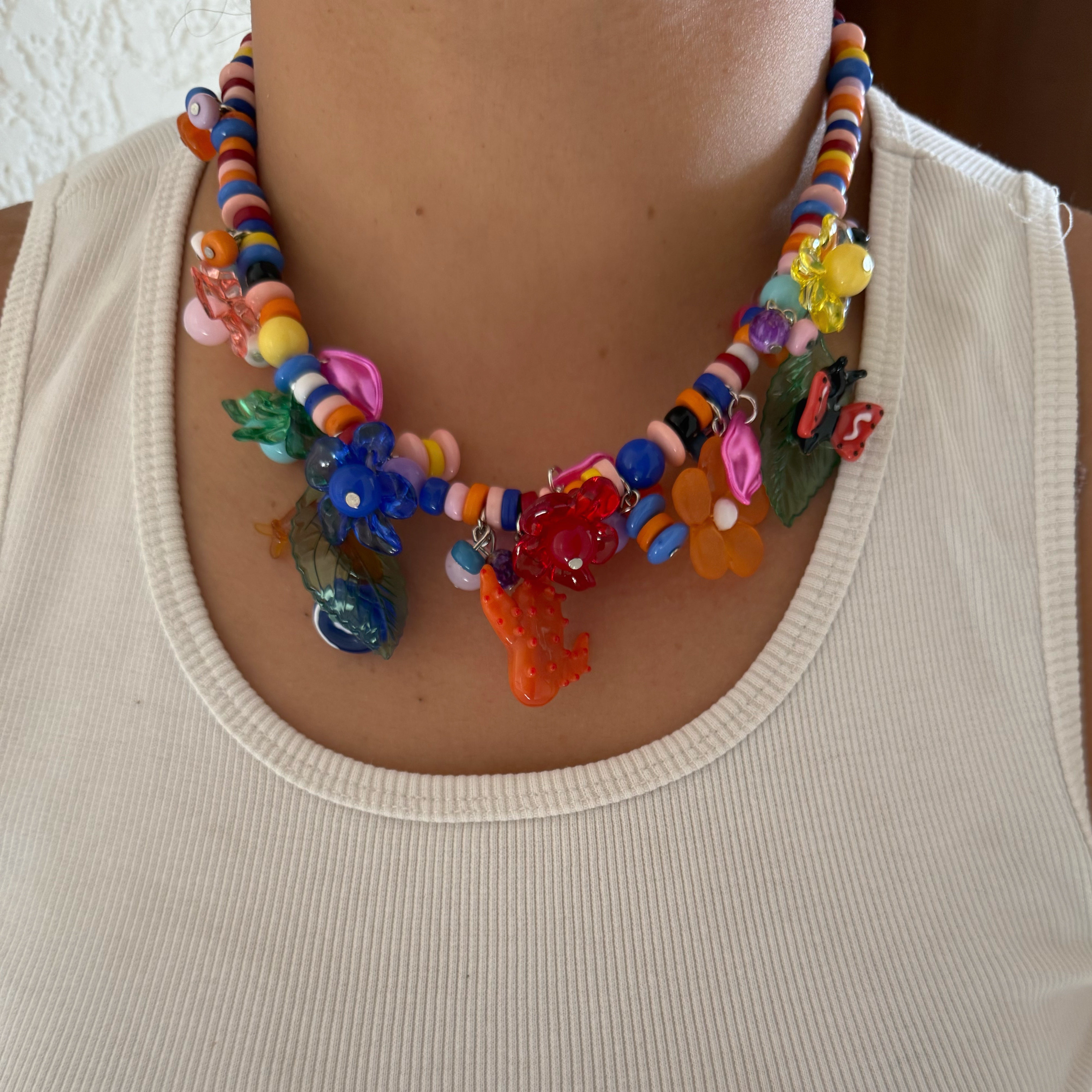 Llena tu look de color y alegría con este collar único, diseñado con cuentas multicolores y charms divertidos que evocan un pequeño jardín encantado. Flores, hojas, mariquitas y figuras en tonos vibrantes se combinan para crear una pieza llamativa y original que transforma cualquier outfit.