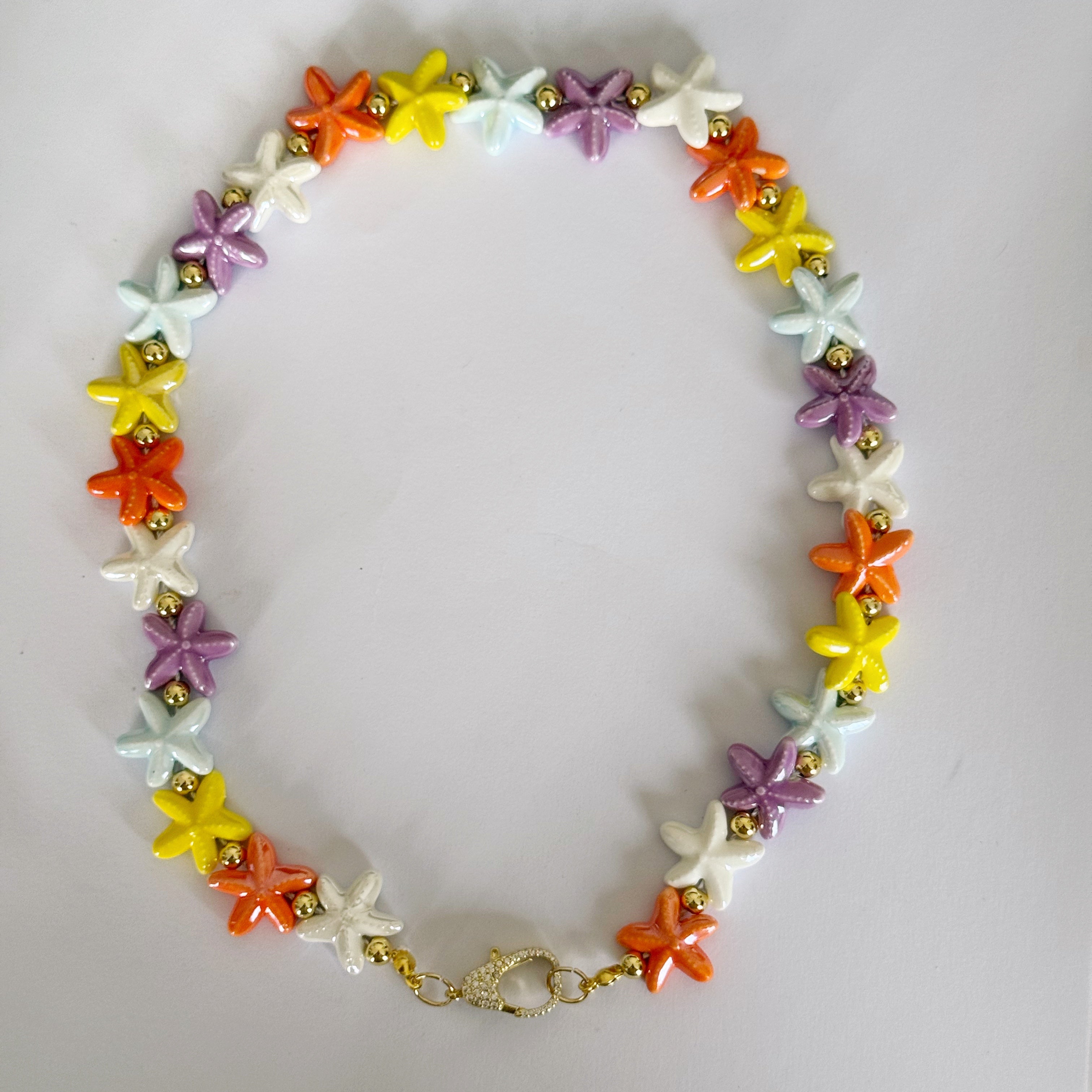 Creamos este collar con estrellas de mar en varios colores y cuentas doradas. Amamos el resultado