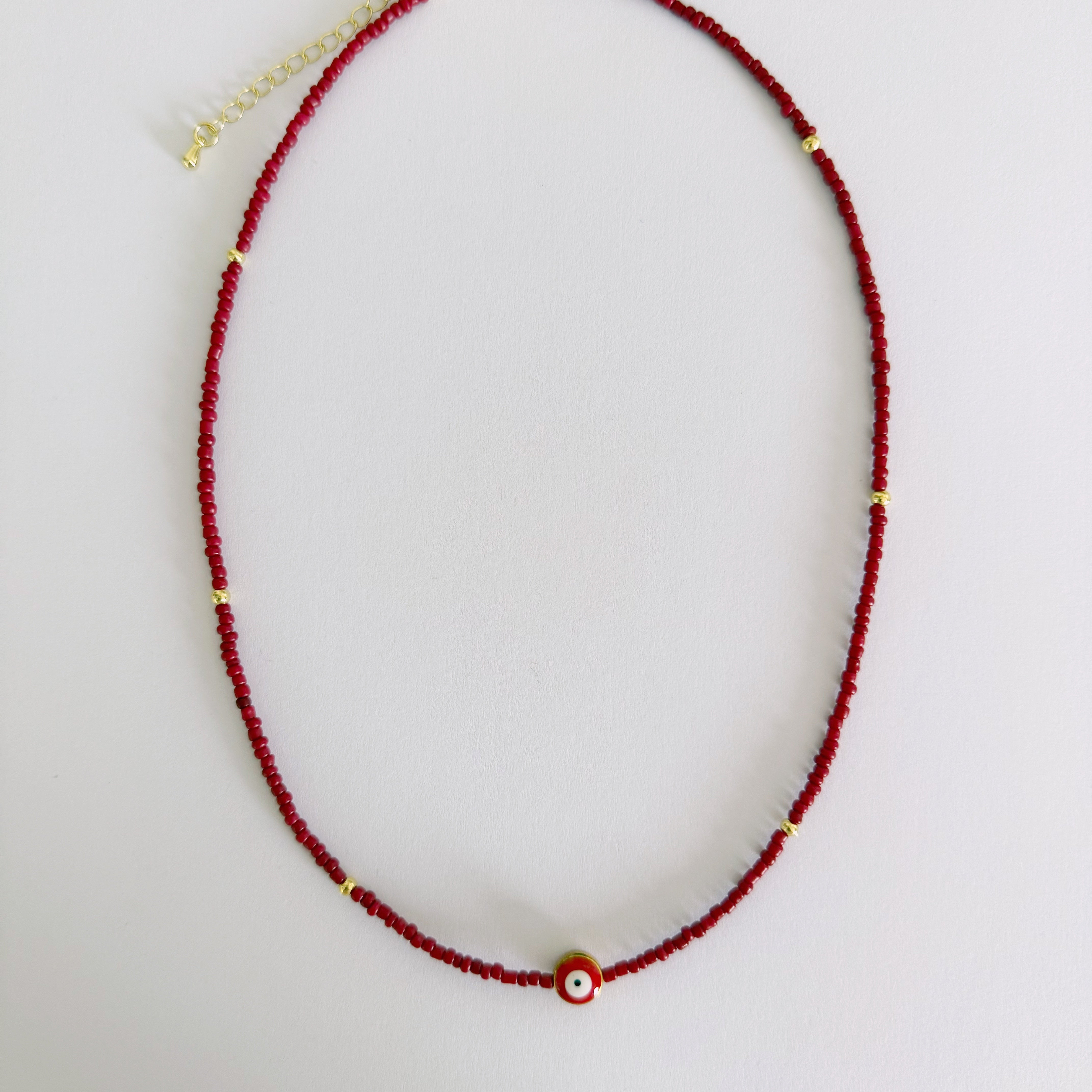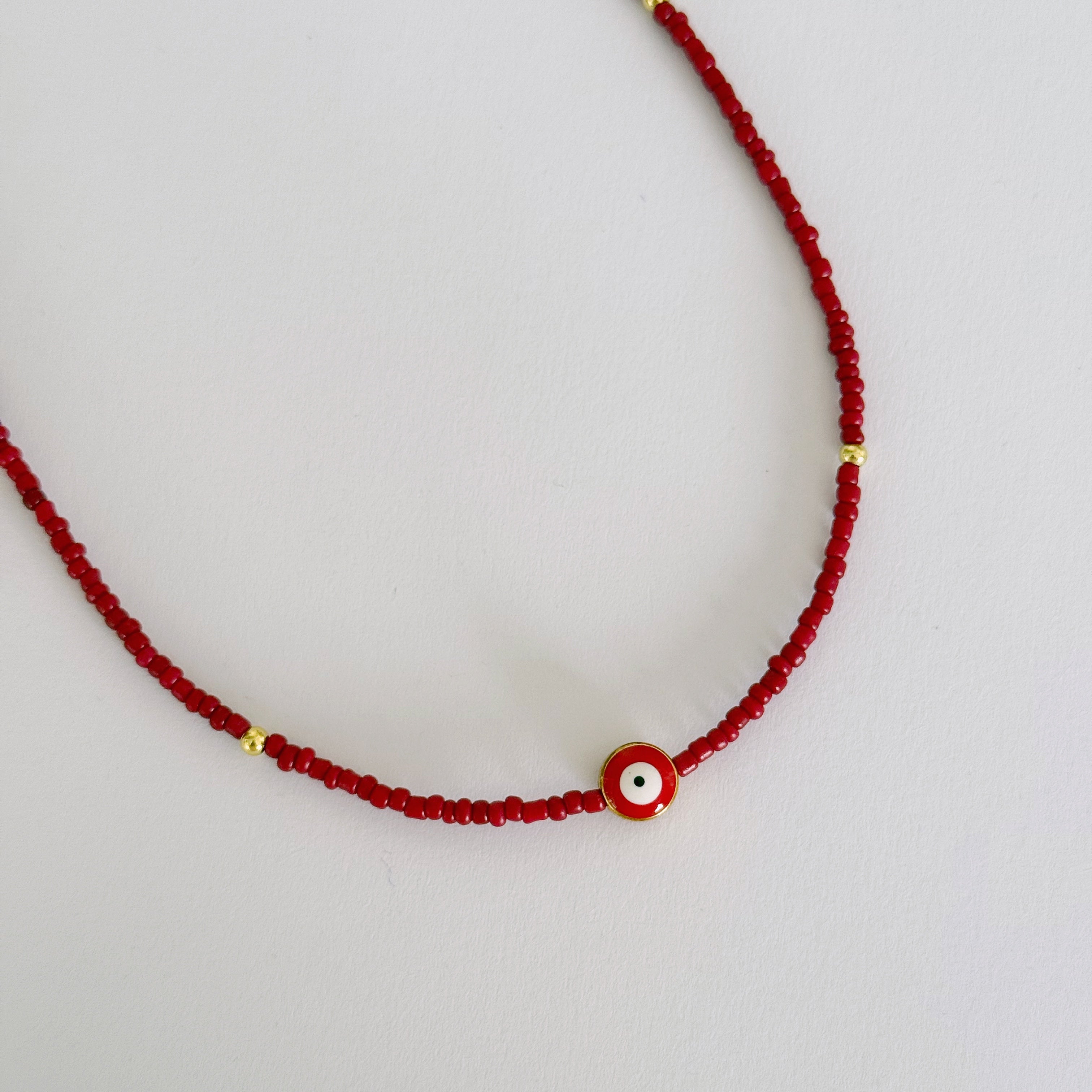 - Hecho a mano con chaquiras rojas y cuentas metálicas.