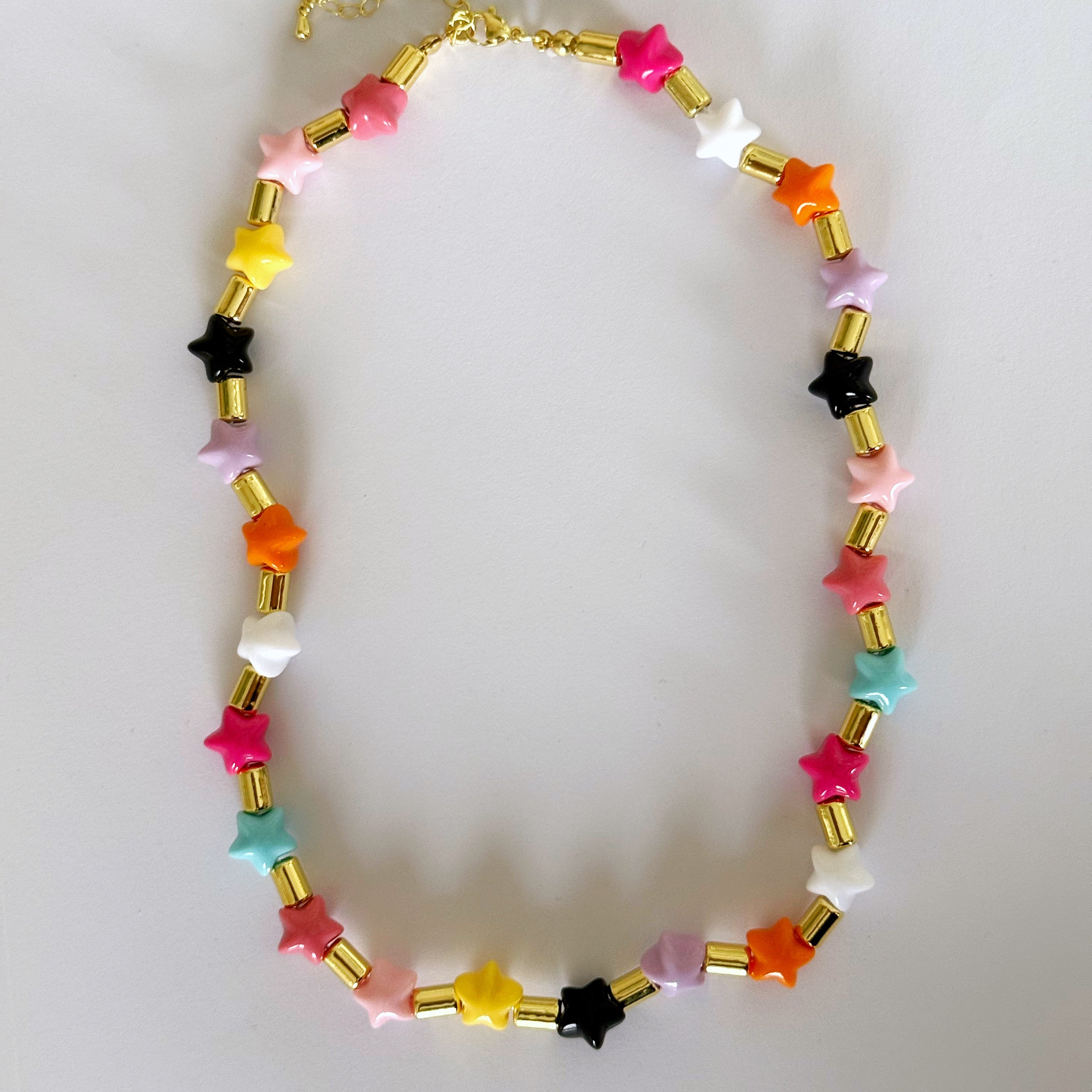 Ilumina tu estilo con este collar lleno de color y energía. Sus cuentas en forma de estrella en tonos vibrantes, combinadas con separadores dorados, lo convierten en el accesorio perfecto para darle un toque divertido y chic a cualquier look. Ideal para usar solo o combinar con otros collares, este diseño es ligero, cómodo y versátil para todos los días. ✨