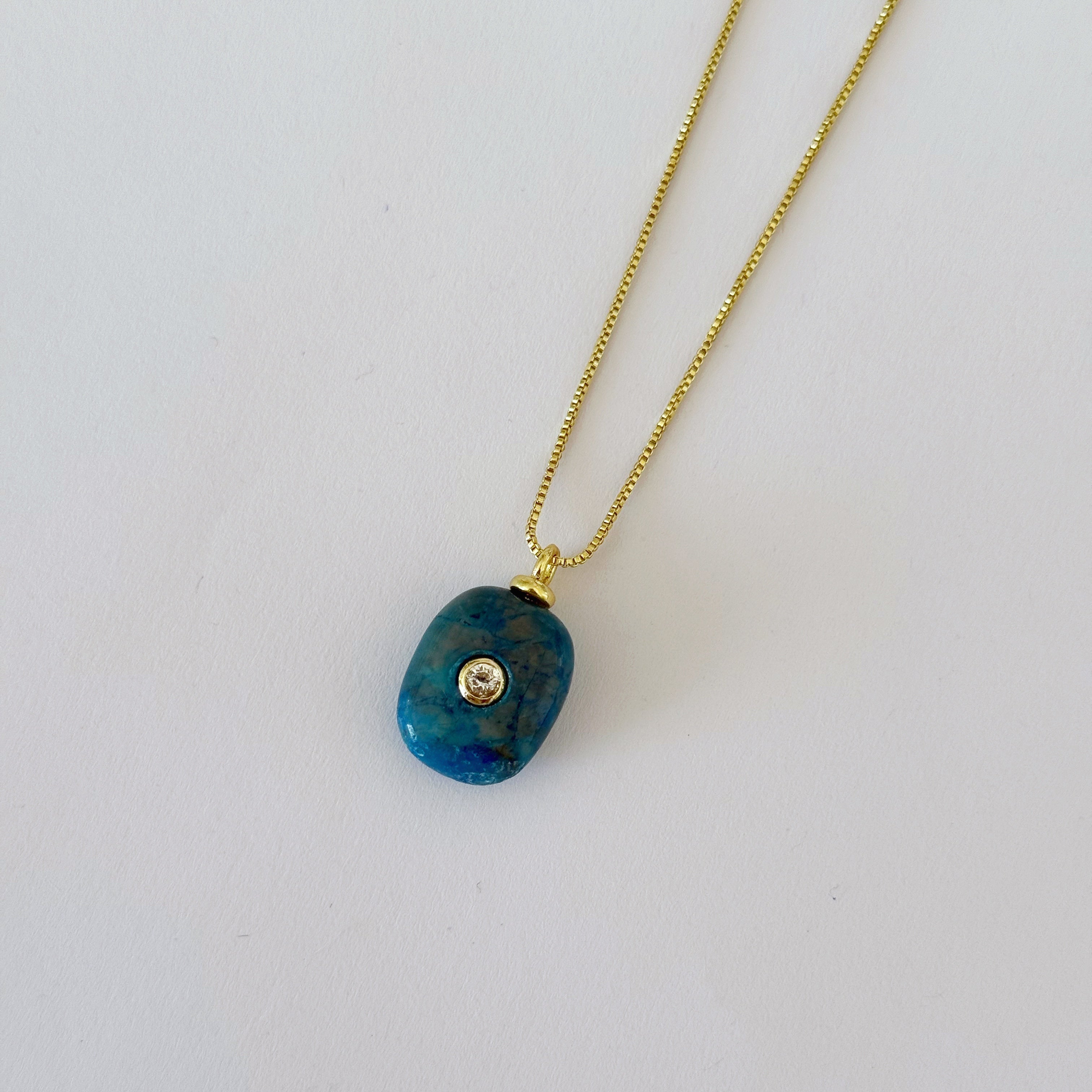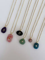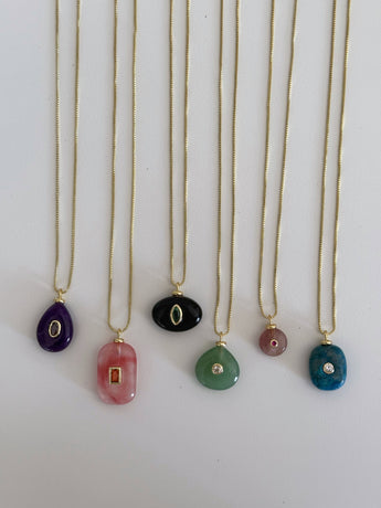 Los Amulet Stones son collares con piedras naturales seleccionadas por su energía, color y forma única. Cada piedra está engarzada con un toque de brillo en chapa de oro, creando un amuleto moderno, minimalista y con significado.