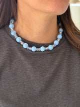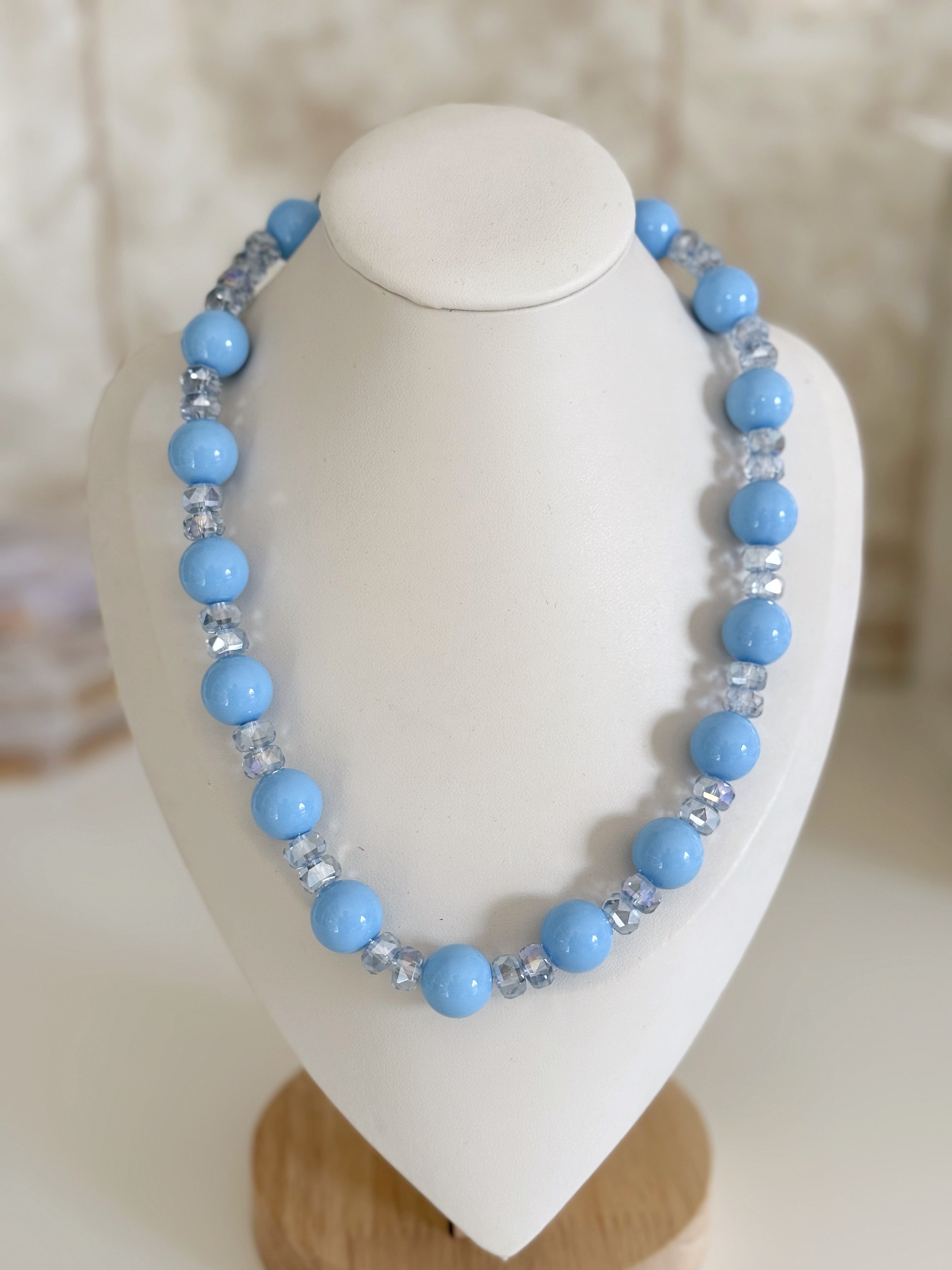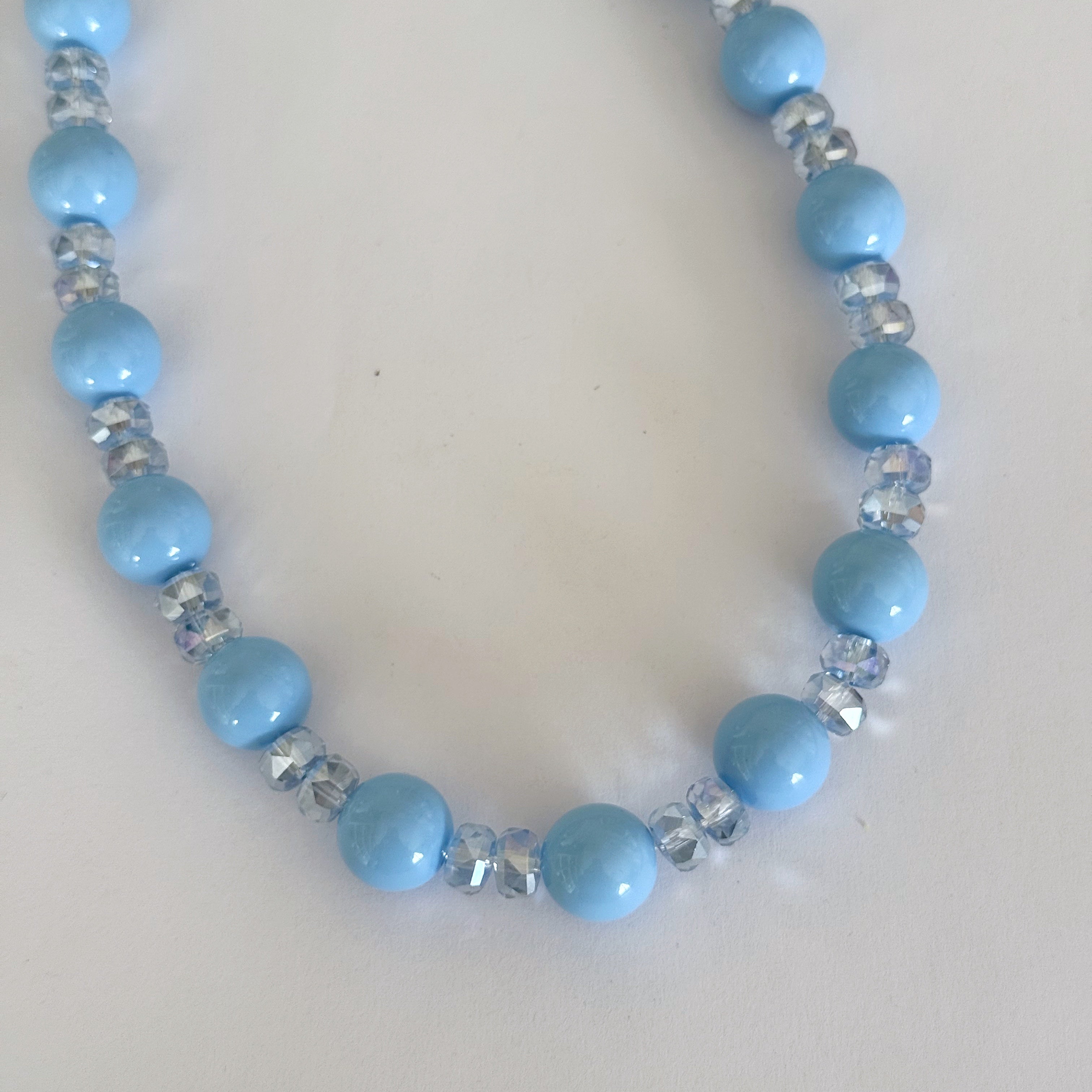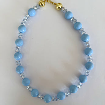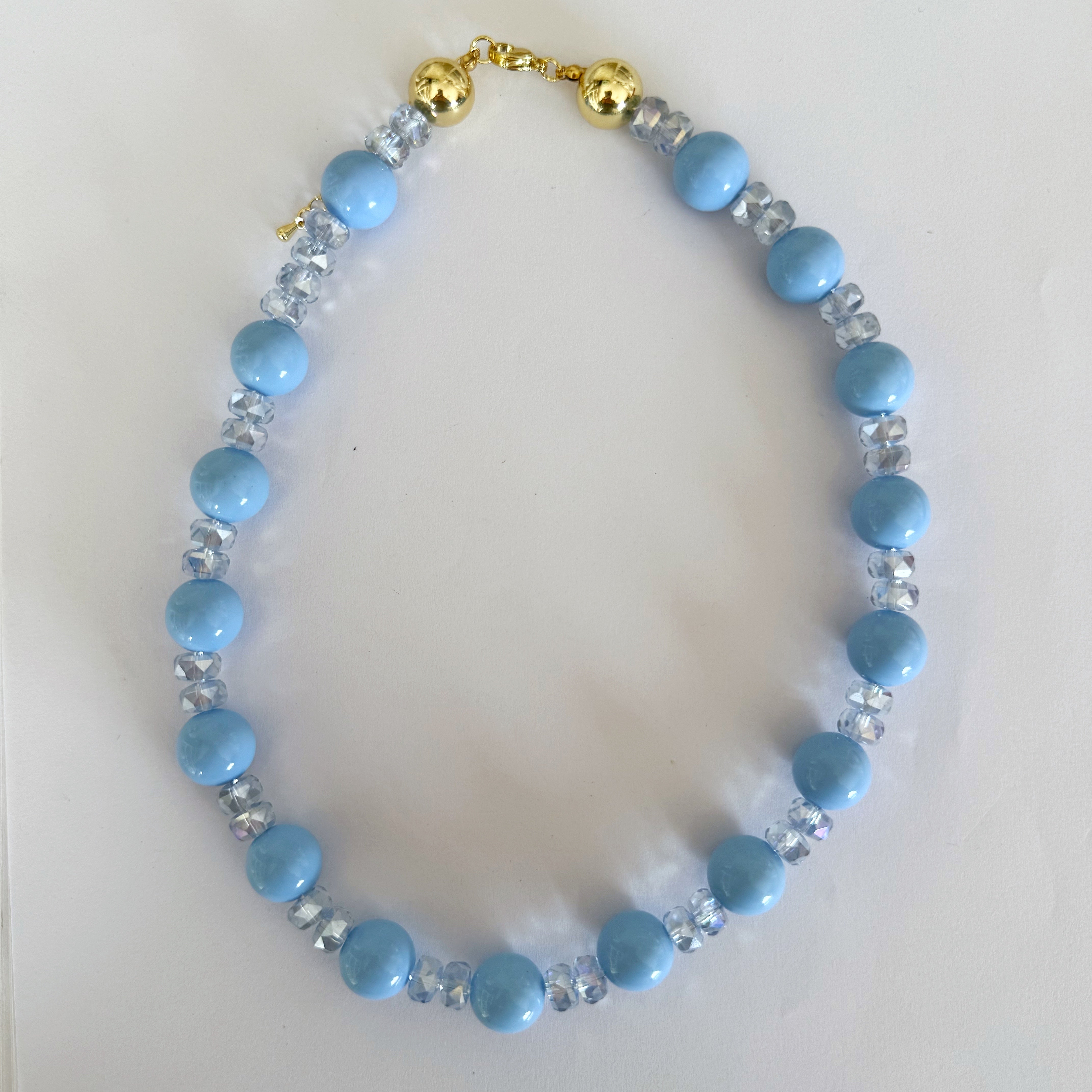 Perlas en tono azul suave se combinan con cristales facetados que capturan la luz en cada movimiento, creando una pieza fresca, luminosa y sofisticada. El detalle dorado aporta ese toque chic que eleva cualquier look