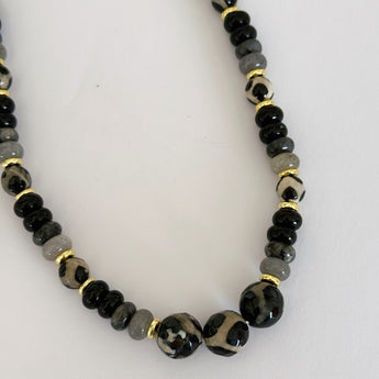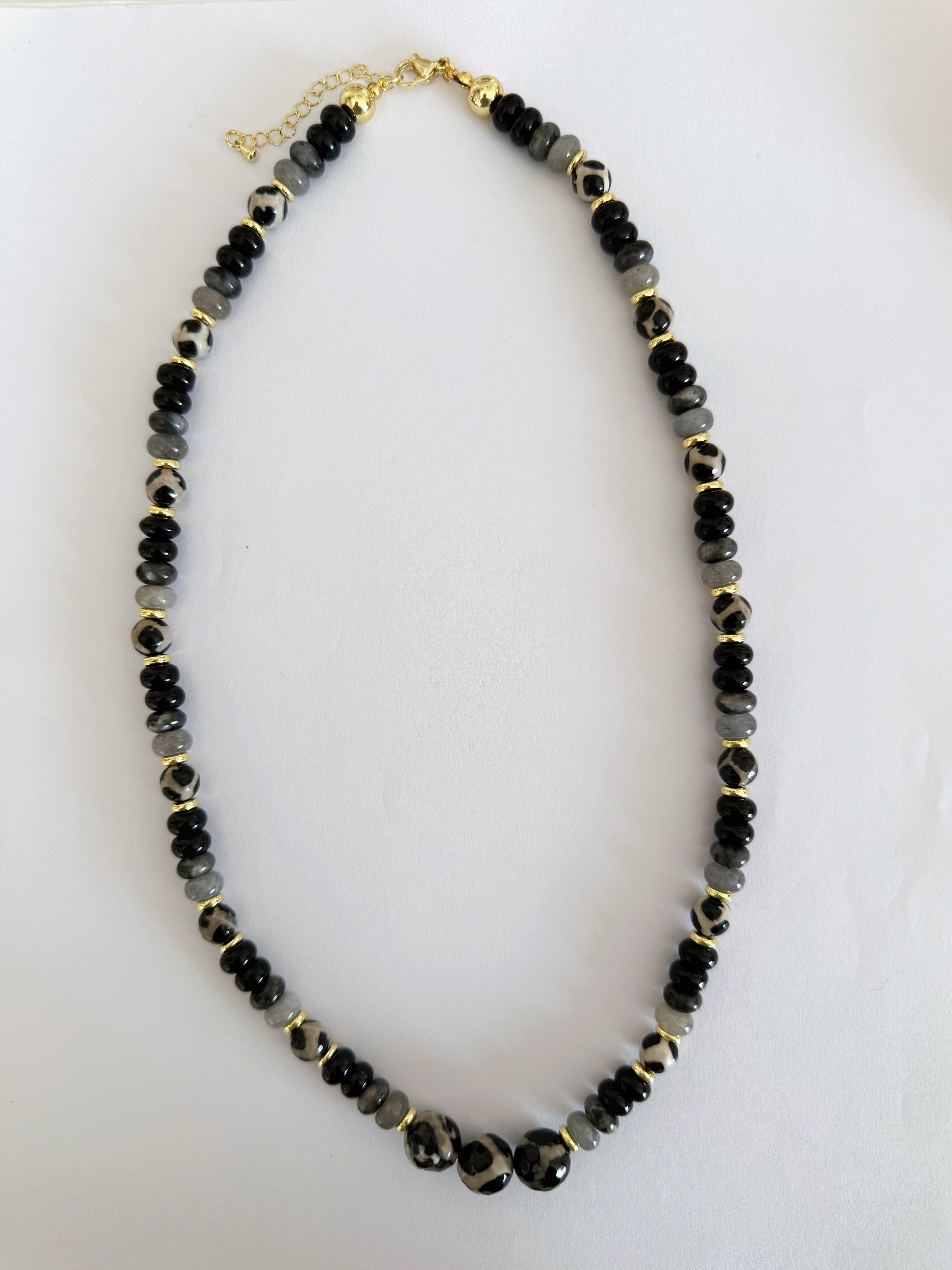 Este collar combina cuentas en tonos negro y gris humo con acentos dorados que aportan un brillo sutil y sofisticado. Su diseño estilizado y atemporal lo convierte en la pieza perfecta para elevar cualquier look, desde outfits casuales hasta ocasiones especiales.