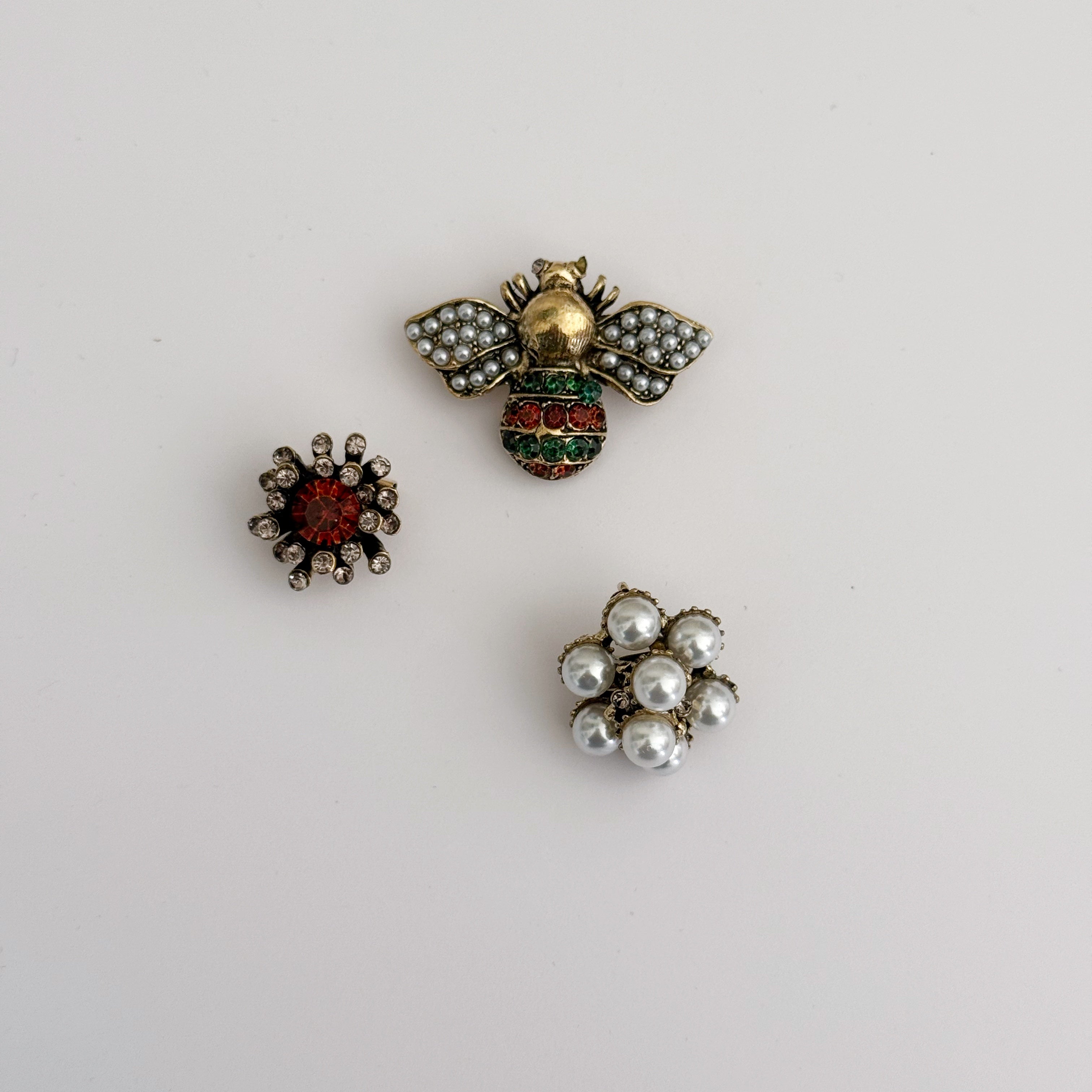 Set de 3 broches en tono dorado: uno con diseño floral de perlas y otro con cristal central rojo rodeado de destellos y el ultimo en forma de abeja con alas de perlas y el cuerpo de cristales verdes y rojos.