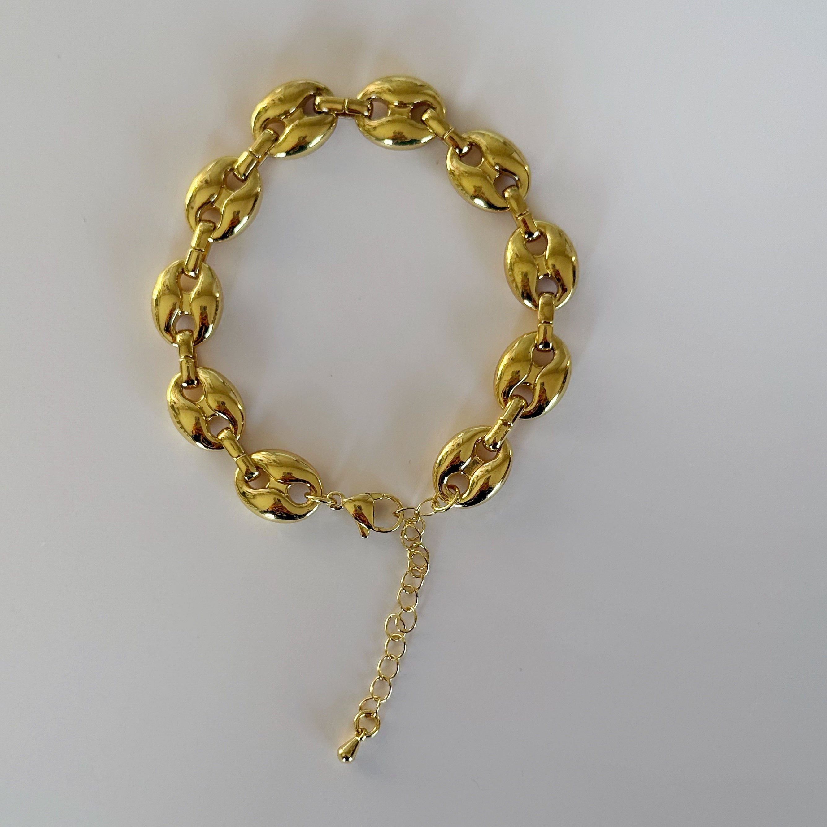 La Pulsera Golden Links es el accesorio perfecto para elevar cualquier look. Su diseño de eslabones ovalados con acabado dorado brillante aporta un estilo moderno y sofisticado, ideal para llevar sola o combinar con otras pulseras para un efecto más audaz. Cuenta con extensión ajustable para un fit cómodo y versátil.